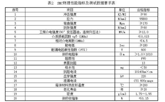 2.3.1分支箱外殼選用S304不銹鋼資料,箱體、門體資料厚度均不應(yīng)小于2毫米,或SMC復(fù)合資料箱體,SMC物理功用方針及測(cè)試數(shù)據(jù)滿足表2的要求。